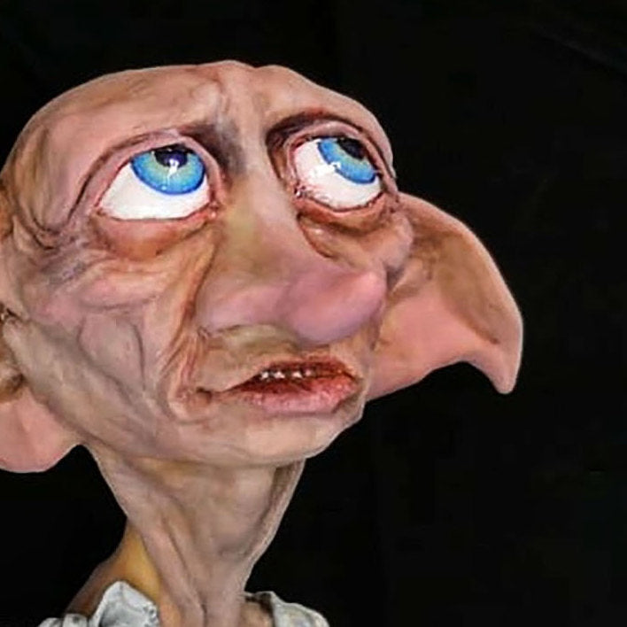 Scultura artigianale raffigurante Dobby, l'elfo domestico, ispirato alle creature del film "Harry Potter".