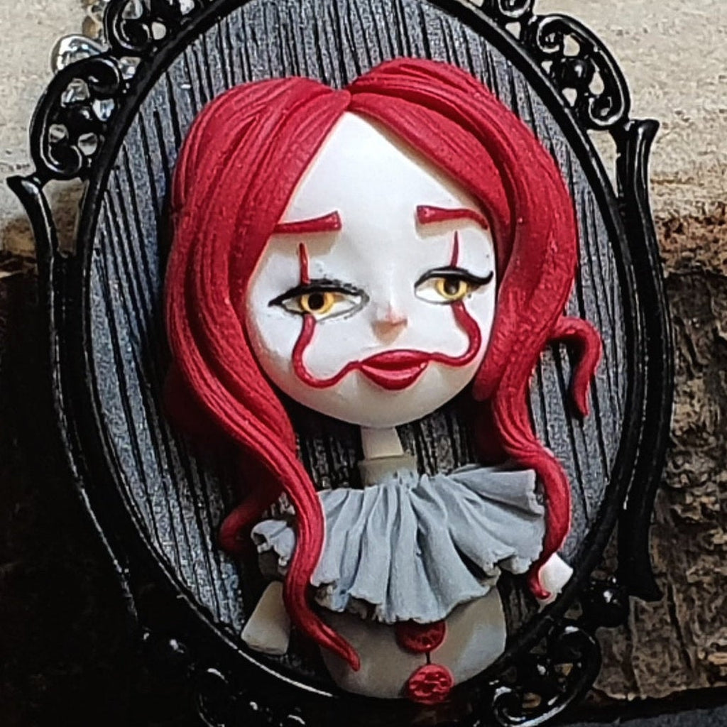 Collana su base cameo REALIZZATA A MANO con paste sintetiche ispirata alla bambola del film horror " IT " di Stephen King