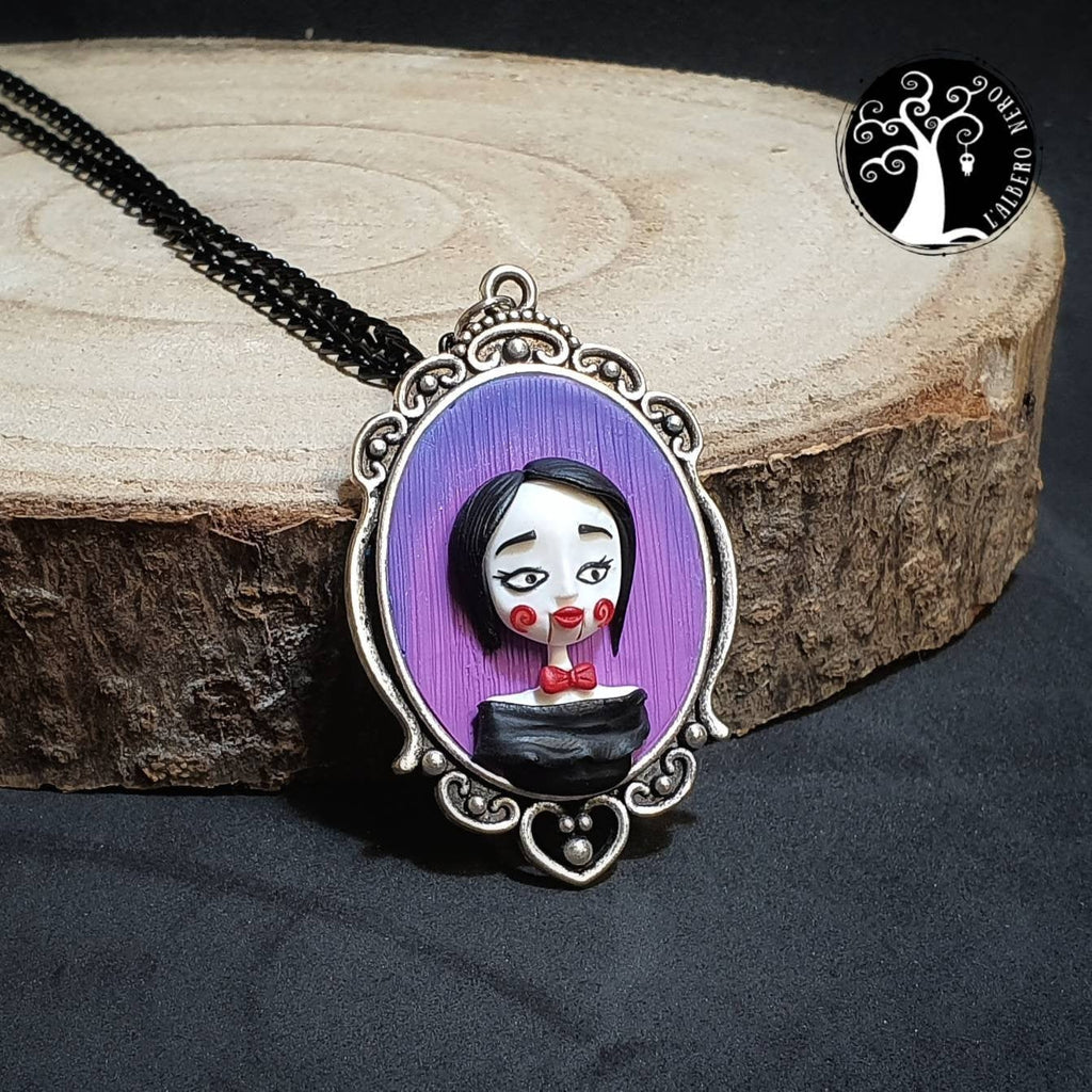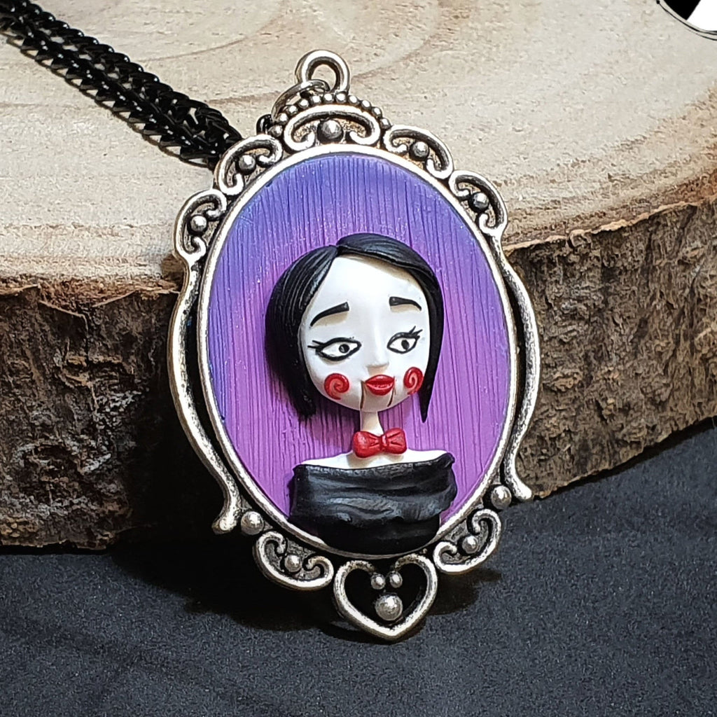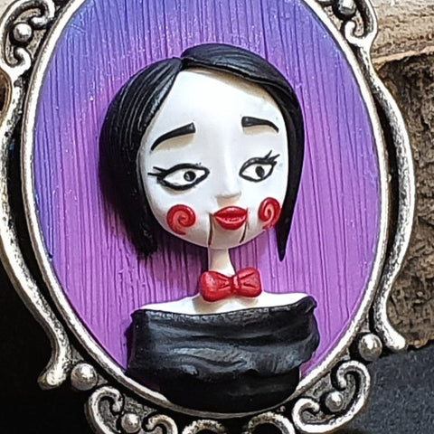 Collana su base cameo REALIZZATA A MANO con paste sintetiche ispirata alla bambola del film horror Saw-l'enigmista.